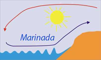 Durant el dia la terra està més calenta i l'aire augmenta de pressió que origina un desplaçament de les masses altes d'aquest cap al mar. El buit que es forma a la zona costanera per recuperar l'aire que s'ha escapat per les zones altes , produeix un vent cap a la costa des de la mar. D'aquesta manera s'origina durant el dia la marinada.